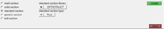 如前所述,在OptiStruct中可利用现成的横截面。因此,确保在standard section library中激活OPTISTRUCT。在可用的横截面清单(standard section type:)中,选取一个感兴趣的。上面的这个设置为Rod(Box,H等类型也可以)。注意,“Rod”是横截面的名字-并没有关于1D单元的任何说明。