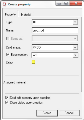 接下来,需要创建CROD单元的材料集(右键点击Model Browser > Create > Property)。在材料集的弹出窗口,Card Image选择PROD。在这里,也可参考前面定义的横截面,也就是梁截面rod与材料steel。