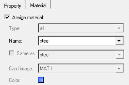 注:如果要用CBEAM或CBAR单元,其属性Card Image可以是PBEAML或PBARL (L = 如同正在使用数据库)。激活Material标签及Property,并将之前创建的材料steel赋于到这个属性集中。